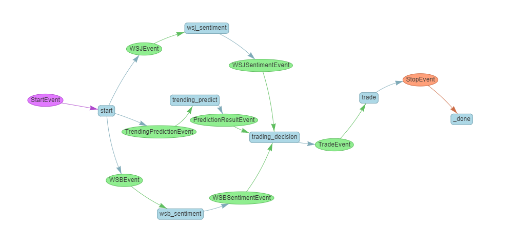 return StopEvent(result='We are done for the day.')In the start method, we use ctx.send_event to simultaneously throw out WSBEvent, WSJEvent, and TrendingPredictionEvent. Since Workflow determines which messages were thrown out based on the typing annotation of the step method, we still need to mark the returned message types.